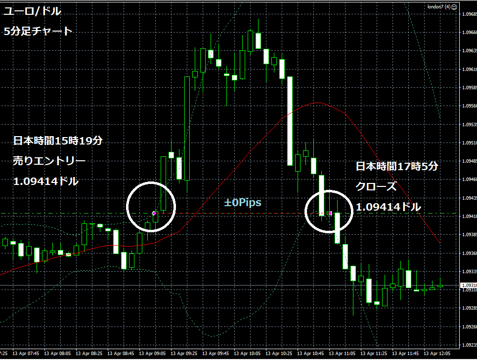 JUGEMテーマ:FX 情報分析 4月13日のFXTF(ゴールデンウエイ・ジャパン)の1000通貨コースでのデモトレードで自作EA「ロンドンは午前7時」は、日本時間15時19分にユーロ/ドルのショートポジション(ユーロ売りドル買い)を1.09414ドルでエントリーし日本時間17時05分に1.09414ドルでポジションをクローズして±0Pipsで0円の利益となった。(Lot数は0.5。5万通貨) 2019年2月26日からのフォワードテスト144勝70敗(144勝/213トレード、勝率67.61%、引き分け含まず)で433.2pipsのプラスで27万1,900円の利益となっ...