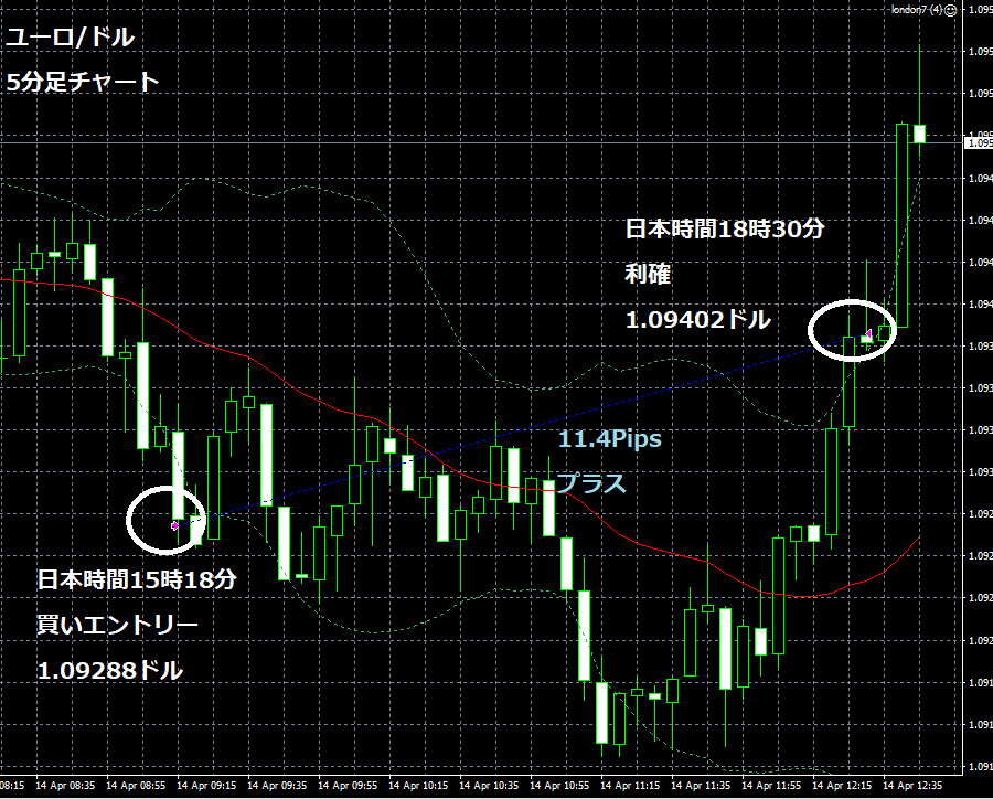JUGEMテーマ:FX 情報分析 4月14日のFXTF(ゴールデンウエイ・ジャパン)の1000通貨コースでのデモトレードで自作EA「ロンドンは午前7時」は、日本時間15時18分にユーロ/ドルのロングポジション(ユーロ買いドル売り)を1.09288ドルでエントリーし日本時間18時30分に1.09402ドルでポジションをクローズして11.4Pipsのプラスで6,123円の利益となった。(Lot数は0.5。5万通貨) 2019年2月26日からのフォワードテスト145勝70敗(145勝/214トレード、勝率67.76%、引き分け含まず)で444.6pipsのプラスで27万8,023円の利益と...