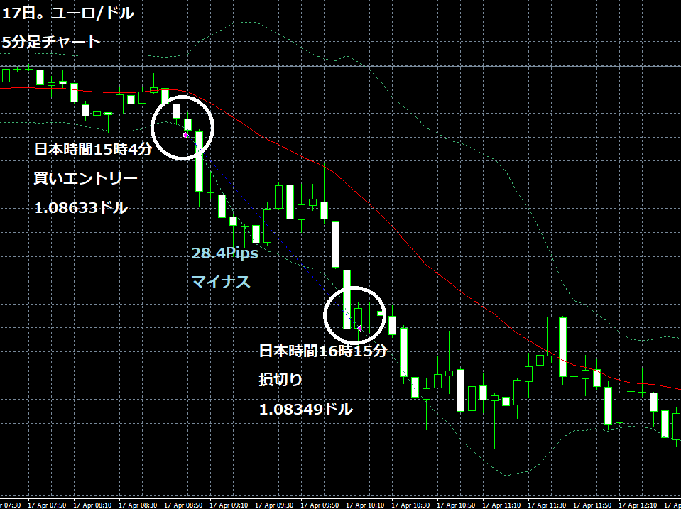JUGEMテーマ:FX 情報分析 4月17日のFXTF(ゴールデンウエイ・ジャパン)の1000通貨コースでのデモトレードで自作EA「ロンドンは午前7時」は、日本時間15時04分にユーロ/ドルのロングポジション(ユーロ買いドル売り)を1.08633ドルでエントリーし日本時間16時15分に1.08349ドルでポジションをクローズして28.4Pipsのマイナスで15,298円の損失となった。(Lot数は0.5。5万通貨) 2019年2月26日からのフォワードテスト146勝72敗(146勝/217トレード、勝率67.28%、引き分け含まず)で398.9pipsのプラスで25万3,488円の利...