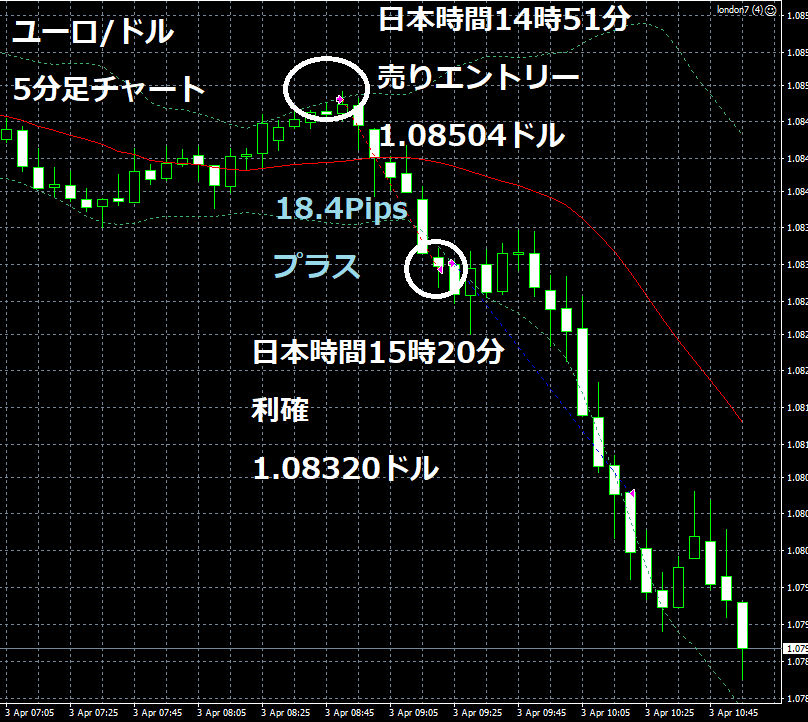 JUGEMテーマ:FX 情報分析 4月2日のFXTF(ゴールデンウエイ・ジャパン)の1000通貨コースでのデモトレードで自作EA「ロンドンは午前7時」は、日本時間15時04分にユーロ/ドルのショートポジション(ユーロ売りドル買い)を1.09517ドルでエントリーし日本時間16時00分に1.09371ドルでポジションをクローズして14.6Pipsのプラスで7,836円の利益となった。(Lot数は0.5。5万通貨) 2019年2月26日からのフォワードテスト141勝69敗(141勝/209トレード、勝率67.46%、引き分け含まず)で386.4pipsのプラスで24万6,511円の利益...