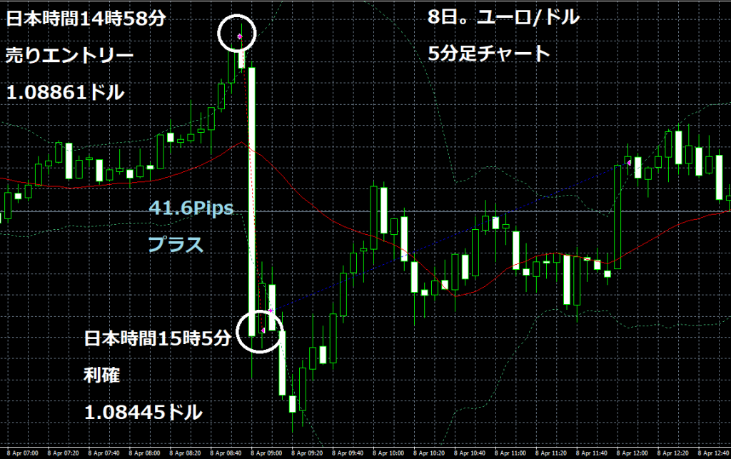 JUGEMテーマ:FX 情報分析 4月8日のFXTF(ゴールデンウエイ・ジャパン)の1000通貨コースでのデモトレードで自作EA「ロンドンは午前7時」は、日本時間14時58分にユーロ/ドルのショートポジション(ユーロ売りドル買い)を1.08861ドルでエントリーし日本時間15時05分に1.08445ドルでポジションをクローズして41.6Pipsのプラスで2万2641円の利益となった。(Lot数は0.5。5万通貨) 2019年2月26日からのフォワードテスト143勝70敗(143勝/212トレード、勝率67.45%、引き分け含まず)で415.2pipsのプラスで26万2,102円の利...