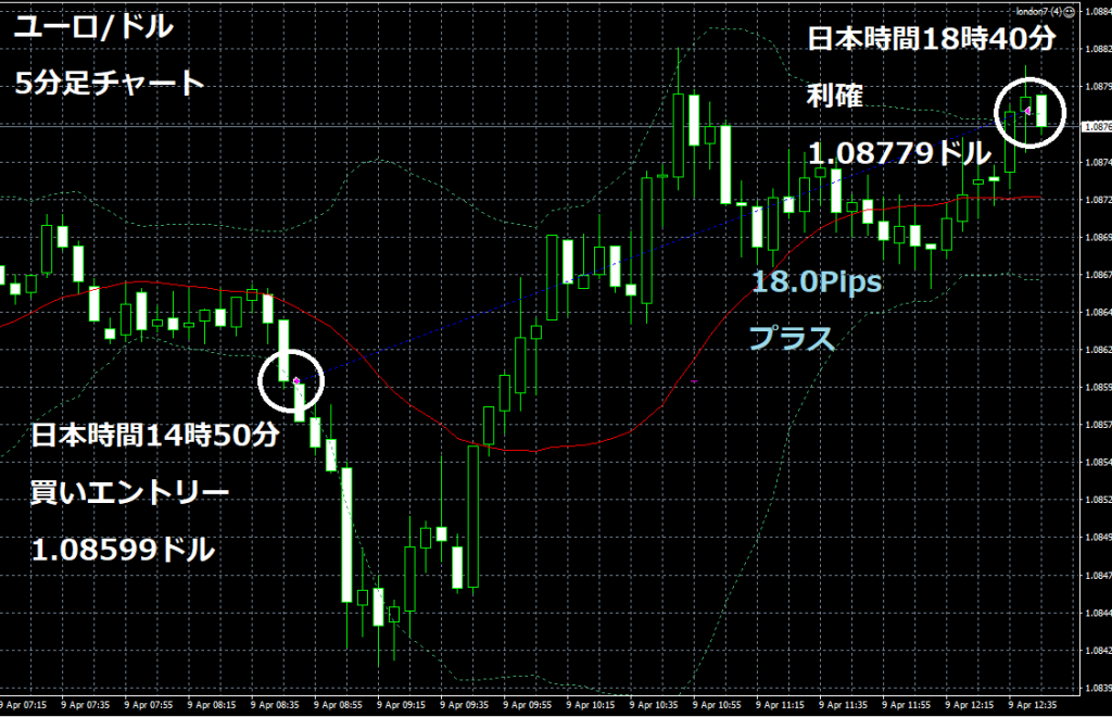 JUGEMテーマ:FX 情報分析 4月9日のFXTF(ゴールデンウエイ・ジャパン)の1000通貨コースでのデモトレードで自作EA「ロンドンは午前7時」は、日本時間14時50分にユーロ/ドルのロングポジション(ユーロ買いドル売り)を1.08599ドルでエントリーし日本時間18時40分に1.08779ドルでポジションをクローズして18.0Pipsのプラスで9,798円の利益となった。(Lot数は0.5。5万通貨) 2019年2月26日からのフォワードテスト144勝70敗(144勝/213トレード、勝率67.61%、引き分け含まず)で433.2pipsのプラスで27万1,900円の利益と...