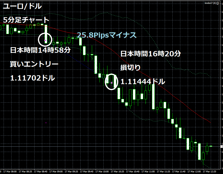 JUGEMテーマ:FX 情報分析 3月17日のFXTF(ゴールデンウエイ・ジャパン)の1000通貨コースでのデモトレードで自作EA「ロンドンは午前7時」は、日本時間14時58分にユーロ/ドルのロングポジション(ユーロ売りドル買い)を1.11702ドルでエントリーし日本時間16時20分に1.11444ドルでポジションをクローズして25.8Pipsのマイナスで13,752円の損失となった。(Lot数は0.5。5万通貨) 2019年2月26日からのフォワードテスト134勝67敗(134勝/200トレード、勝率67.00%、引き分け含まず)で279.5pipsのプラスで18万7,900円の利...