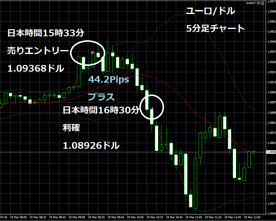 JUGEMテーマ:FX 情報分析 3月19日のFXTF(ゴールデンウエイ・ジャパン)の1000通貨コースでのデモトレードで自作EA「ロンドンは午前7時」は、日本時間15時33分にユーロ/ドルのショートポジション(ユーロ売りドル買い)を1.09368ドルでエントリーし日本時間16時30分に1.08926ドルでポジションをクローズして44.2Pipsのプラスで24,132円の利益となった。(Lot数は0.5。5万通貨) 2019年2月26日からのフォワードテスト135勝67敗(135勝/201トレード、勝率67.16%、引き分け含まず)で323.7pipsのプラスで21万2,032円の利...