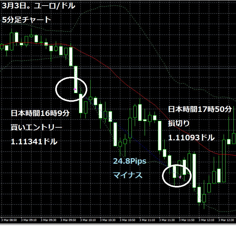 JUGEMテーマ:FX 情報分析 3月3日のFXTF(ゴールデンウエイ・ジャパン)の1000通貨コースでのデモトレードは、夏時間に変更されたのでこの期間は、ForexExchangeのデモ口座で測定している。自作EA「ロンドンは午前7時」は、日本時間16時09分にユーロ/ドルのロングポジション(ユーロ買いドル売り)を1.11341ドルでエントリーし日本時間17時50分に1.11093ドルでポジションをクローズして24.8Pipsのマイナスで13,398円の損失となった。(Lot数は0.5。5万通貨) 2019年2月26日からのフォワードテスト129勝64敗(129勝/192ト...