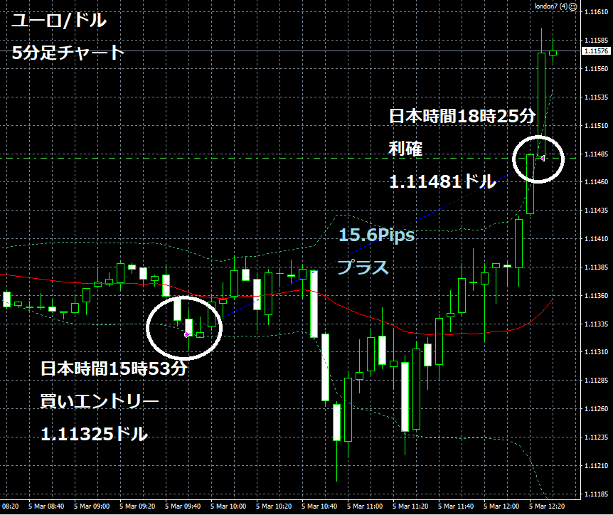 JUGEMテーマ:FX 情報分析 3月5日のFXTF(ゴールデンウエイ・ジャパン)の1000通貨コースでのデモトレードは、夏時間に変更されたのでこの期間は、ForexExchangeのデモ口座で測定している。自作EA「ロンドンは午前7時」は、日本時間15時53分にユーロ/ドルのロングポジション(ユーロ買いドル売り)を1.11325ドルでエントリーし日本時間18時25分に1.11481ドルでポジションをクローズして15.6Pipsのプラスで8,354円の利益となった。(Lot数は0.5。5万通貨) 2019年2月26日からのフォワードテスト130勝64敗(130勝/193トレ...