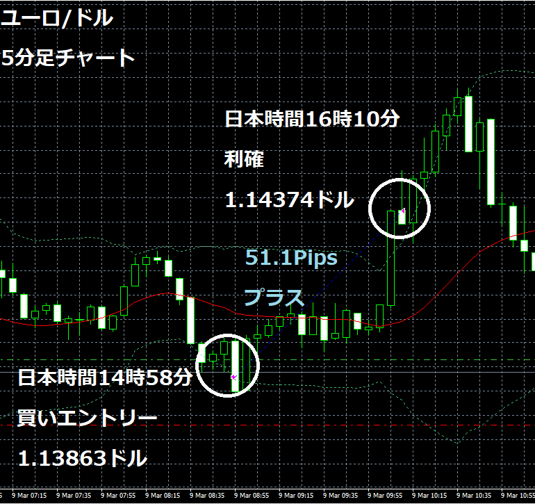JUGEMテーマ:FX 情報分析 3月9日のFXTF(ゴールデンウエイ・ジャパン)の1000通貨コースでのデモトレードで自作EA「ロンドンは午前7時」は、日本時間14時58分にユーロ/ドルのロングポジション(ユーロ買いドル売り)を1.13863ドルでエントリーし日本時間16時10分に1.14374ドルでポジションをクローズして51.1Pipsのプラスで26,141円の利益となった。(Lot数は0.5。5万通貨) 本日より夏時間となり日本時間では、1時間早くトレードするようになる。 2019年2月26日からのフォワードテスト131勝65敗(131勝/195トレード...