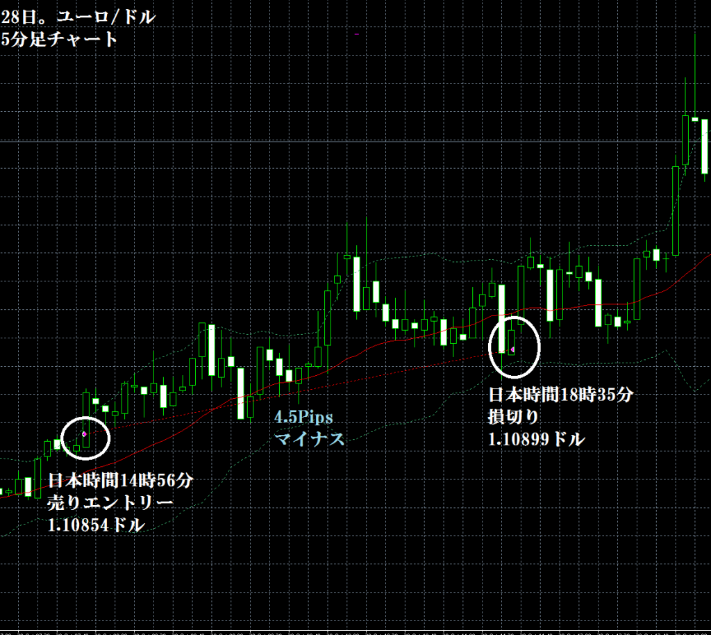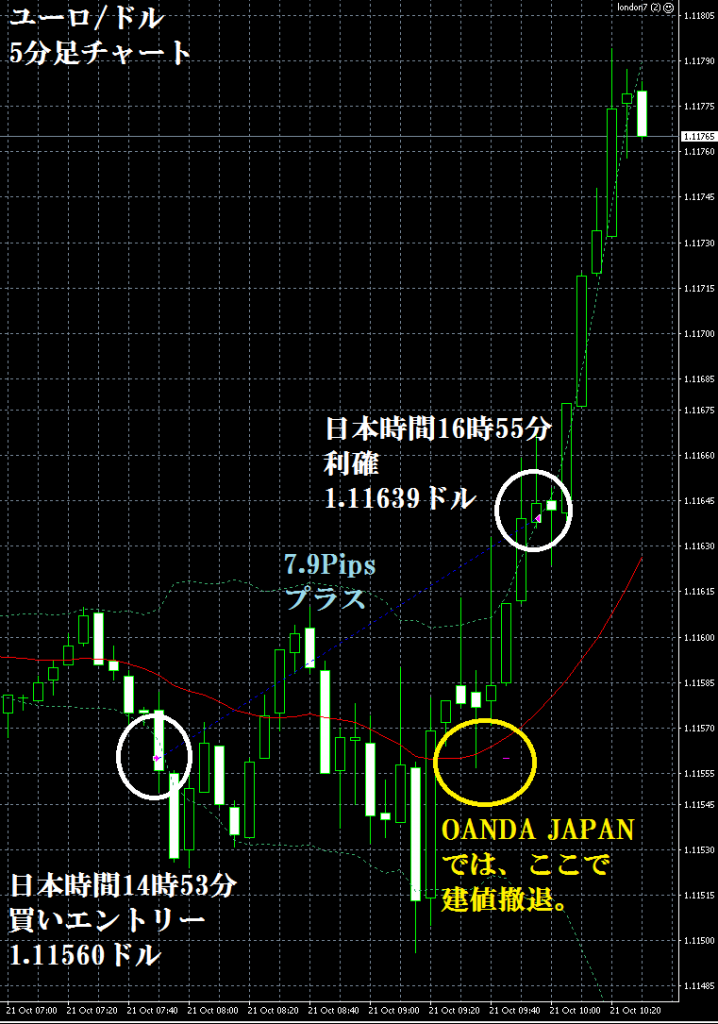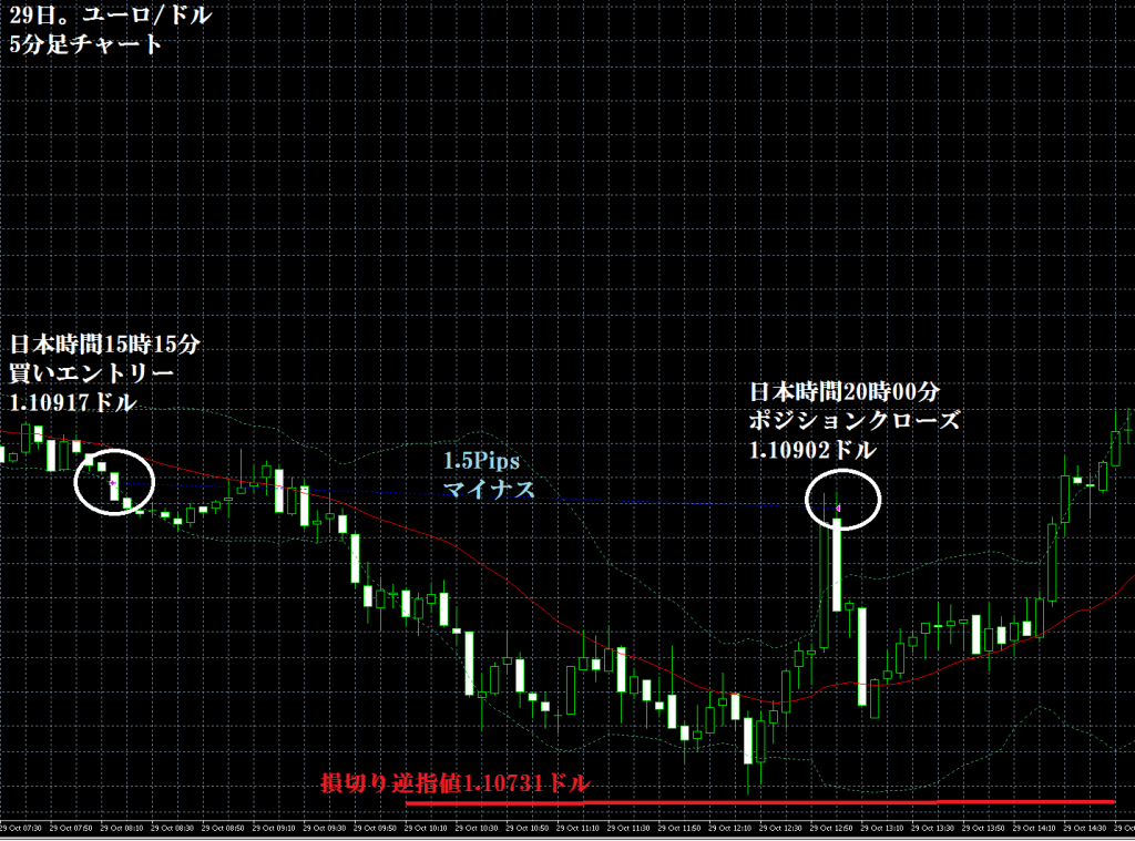 JUGEMテーマ:FX 情報分析 10月28日のFXTF(ゴールデンウエイ・ジャパン)の1000通貨コースでのデモトレードで自作EA「ロンドンは午前7時」は、日本時間14時56分にユーロ/ドルのショートポジション(ユーロ売りドル買い)を1.10854ドルでエントリーし日本時間18時35分に1.10899ドルでポジションをクローズして4.5Pipsのマイナスで2,446円の損失となった。(Lot数は0.5。5万通貨) 2月26日からのフォワードテスト81勝37敗(81勝/118トレード、勝率68.64%、引き分け含まず)で256.8pipsのプラスで17万6,035円の...