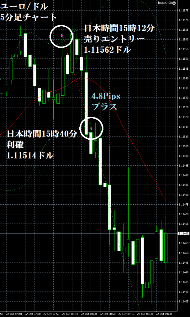 JUGEMテーマ:FX 情報分析 10月22日のFXTF(ゴールデンウエイ・ジャパン)の1000通貨コースでのデモトレードで自作EA「ロンドンは午前7時」は、日本時間15時12分にユーロ/ドルのショートポジション(ユーロ売りドル買い)を1.11562ドルでエントリーし日本時間15時40分に1.11514ドルでポジションをクローズして4.8Pipsのプラスで2,606円の利益となった。(Lot数は0.5。5万通貨) 2月26日からのフォワードテスト79勝35敗(79勝/114トレード、勝率69.30%、引き分け含まず)で259.7pipsのプラスで17万7,618円の利...