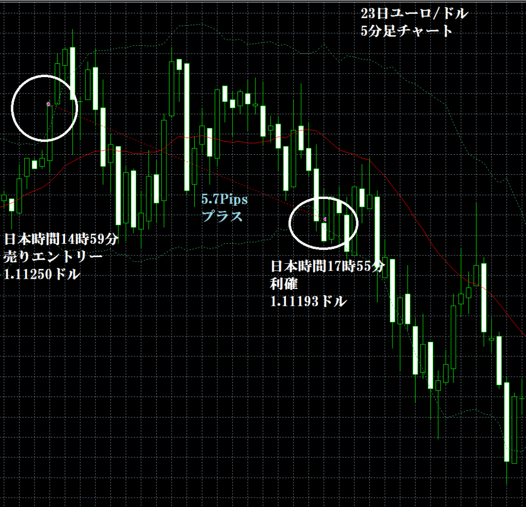 JUGEMテーマ:FX 情報分析 10月23日のFXTF(ゴールデンウエイ・ジャパン)の1000通貨コースでのデモトレードで自作EA「ロンドンは午前7時」は、日本時間14時59分にユーロ/ドルのショートポジション(ユーロ売りドル買い)を1.11250ドルでエントリーし日本時間17時55分に1.11193ドルでポジションをクローズして5.7Pipsのプラスで3,089円の利益となった。(Lot数は0.5。5万通貨) 2月26日からのフォワードテスト80勝35敗(80勝/115トレード、勝率69.59%、引き分け含まず)で265.4pipsのプラスで18万707円の利益...