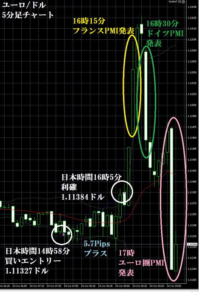 JUGEMテーマ:FX 情報分析 10月24日のFXTF(ゴールデンウエイ・ジャパン)の1000通貨コースでのデモトレードで自作EA「ロンドンは午前7時」は、日本時間14時58分にユーロ/ドルのロングポジション(ユーロ買いドル売り)を1.11327ドルでエントリーし日本時間16時05分に1.11384ドルでポジションをクローズして5.7Pipsのプラスで3,097円の利益となった。(Lot数は0.5。5万通貨) 2月26日からのフォワードテスト81勝35敗(81勝/116トレード、勝率69.83%、引き分け含まず)で271.1pipsのプラスで18万3,804円の利益...