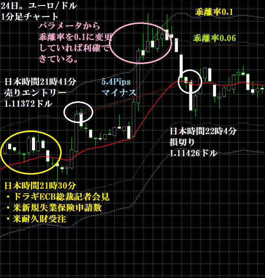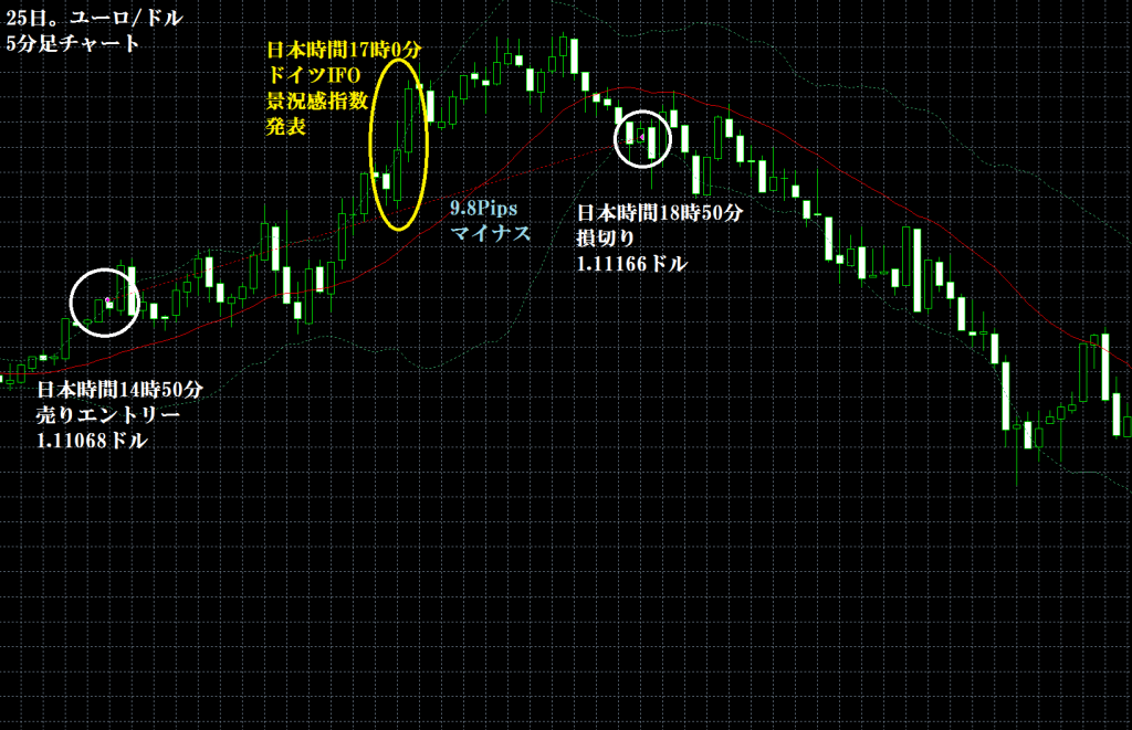 JUGEMテーマ:FX 情報分析 10月25日のFXTF(ゴールデンウエイ・ジャパン)の1000通貨コースでのデモトレードで自作EA「ロンドンは午前7時」は、日本時間14時50分にユーロ/ドルのショートポジション(ユーロ売りドル買い)を1.11068ドルでエントリーし日本時間18時50分に1.11166ドルでポジションをクローズして9.8Pipsのマイナスで5,323円の損失となった。(Lot数は0.5。5万通貨) 2月26日からのフォワードテスト81勝36敗(81勝/117トレード、勝率69.23%、引き分け含まず)で261.3pipsのプラスで17万8,481円の利...