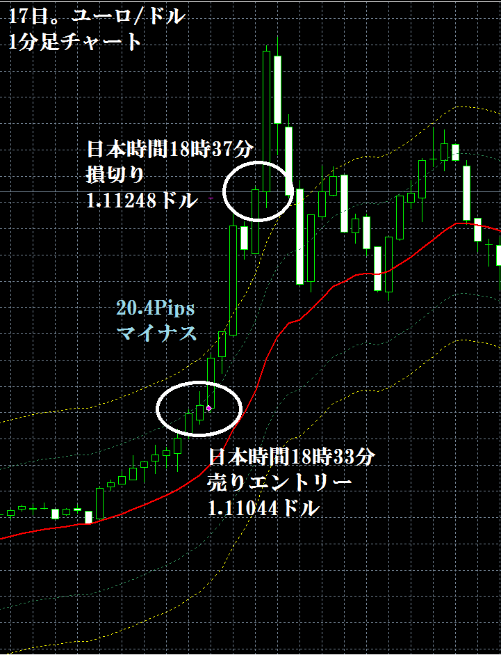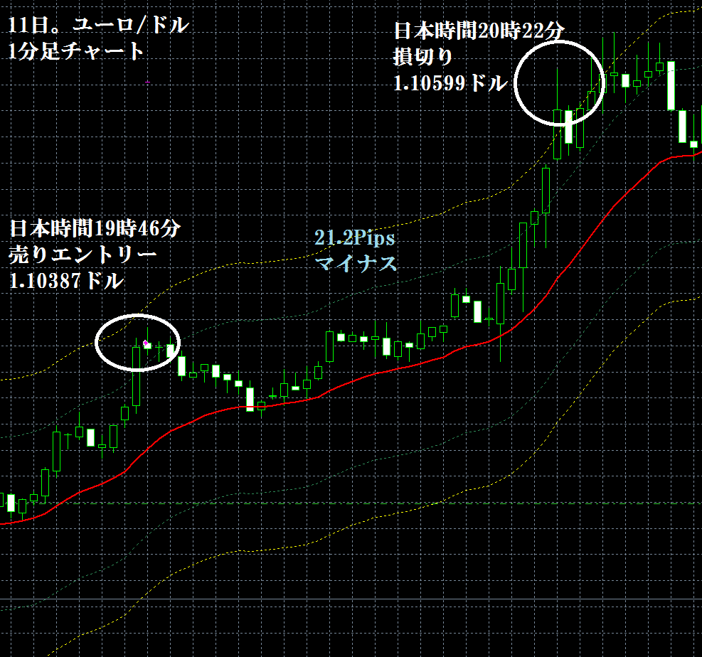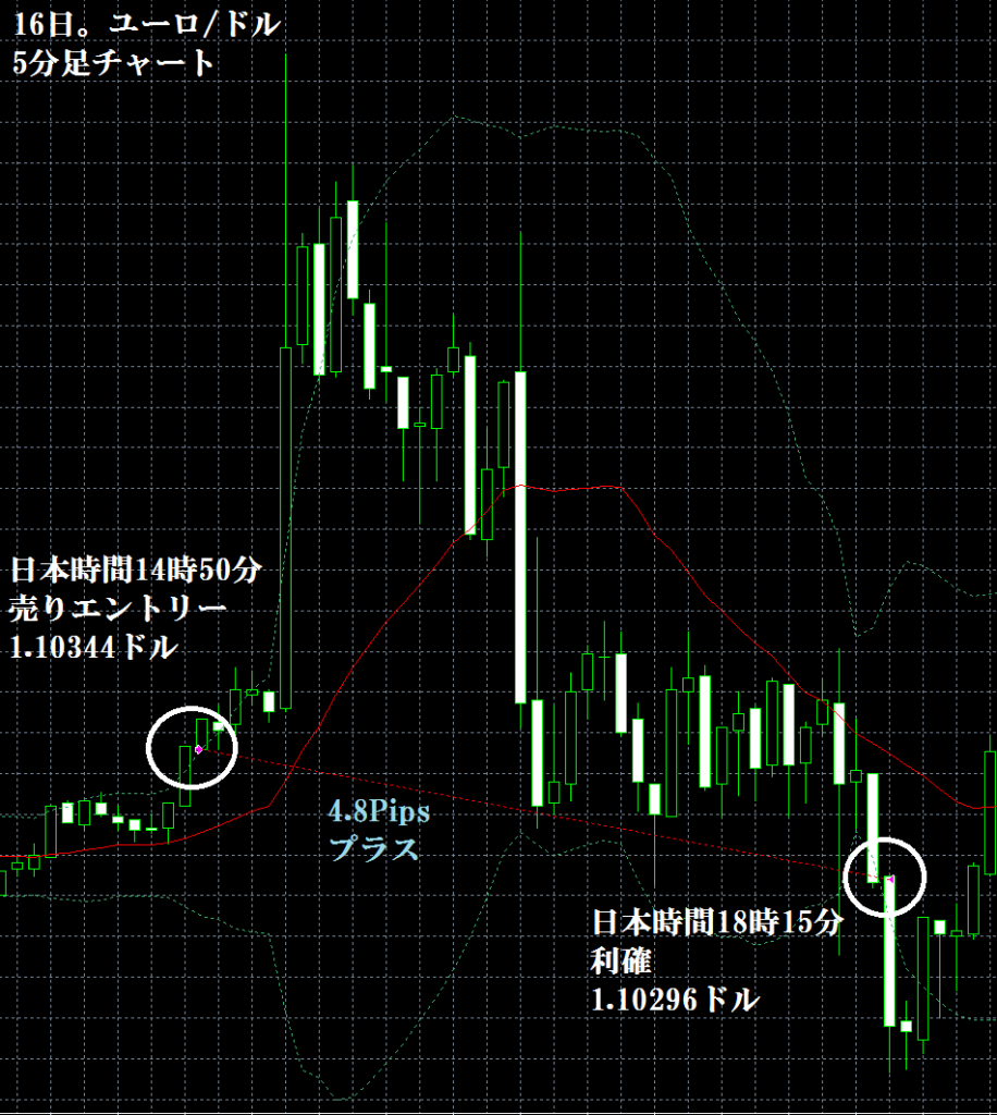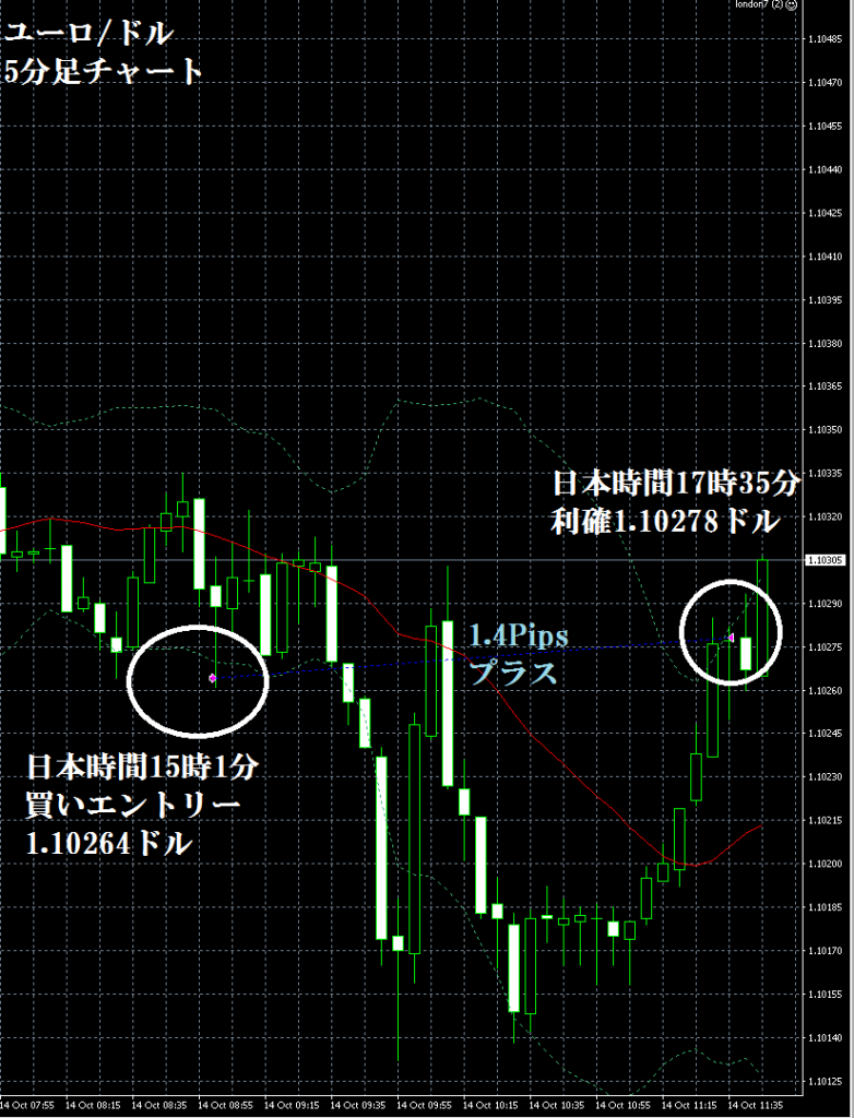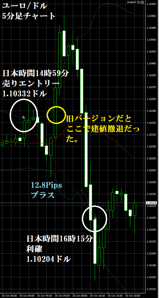 JUGEMテーマ:FX 情報分析 10月16日のFXTF(ゴールデンウエイ・ジャパン)の1000通貨コースでのデモトレードで自作EA「ロンドンは午前7時」は、日本時間14時50分にユーロ/ドルのショートポジション(ユーロ売りドル買い)を1.10344ドルでエントリーし日本時間18時15分に1.10296ドルでポジションをクローズして4.8Pipsのプラスで2,608円の利益となった。(Lot数は0.5。5万通貨) ※OANDA JAPANでは、建値撤退。これは、FXTFの逆指値が、エントリー値よりも5Pips以上離れていないと、指値、逆指値注文が入らないため、建値の...