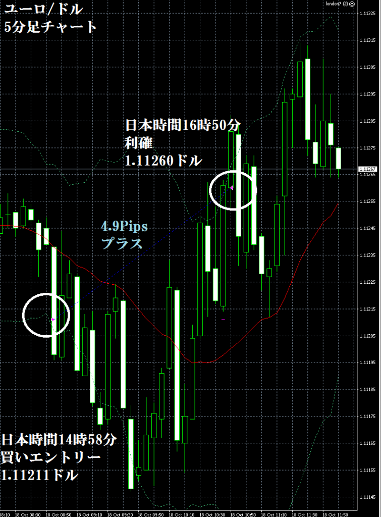 JUGEMテーマ:FX 情報分析 10月18日のFXTF(ゴールデンウエイ・ジャパン)の1000通貨コースでのデモトレードで自作EA「ロンドンは午前7時」は、日本時間14時58分にユーロ/ドルのロングポジション(ユーロ買いドル売り)を1.11211ドルでエントリーし日本時間16時50分に1.11260ドルでポジションをクローズして4.9Pipsのプラスで2,661円の利益となった。(Lot数は0.5。5万通貨) 2月26日からのフォワードテスト77勝35敗(77勝/112トレード、勝率68.75%、引き分け含まず)で247.0pipsのプラスで17万724円の利益とな...