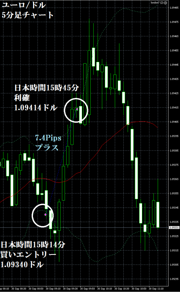 JUGEMテーマ:FX 情報分析 9月30日のFXTF(ゴールデンウエイ・ジャパン)の1000通貨コースでのデモトレードで自作EA「ロンドンは午前7時」は、日本時間15時14分にユーロ/ドルのロングポジション(ユーロ買いドル売り)を1.09340ドルでエントリーし日本時間15時45分に1.09414ドルでポジションをクローズして7.4Pipsのプラスで3,990円の利益となった。(Lot数は0.5。5万通貨) 2月26日からのフォワードテスト67勝31敗(67勝/98トレード、勝率68.36%、引き分け含まず)で198.5pipsのプラスで14万4,546円の利益となった。 ...
