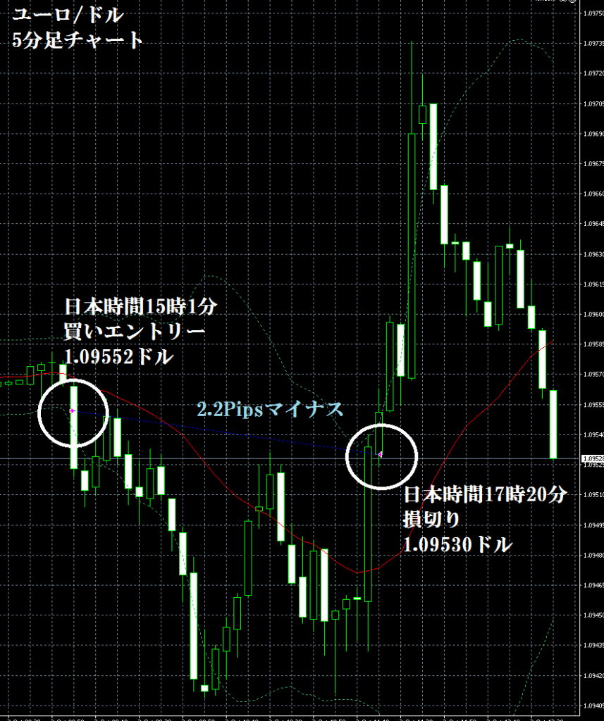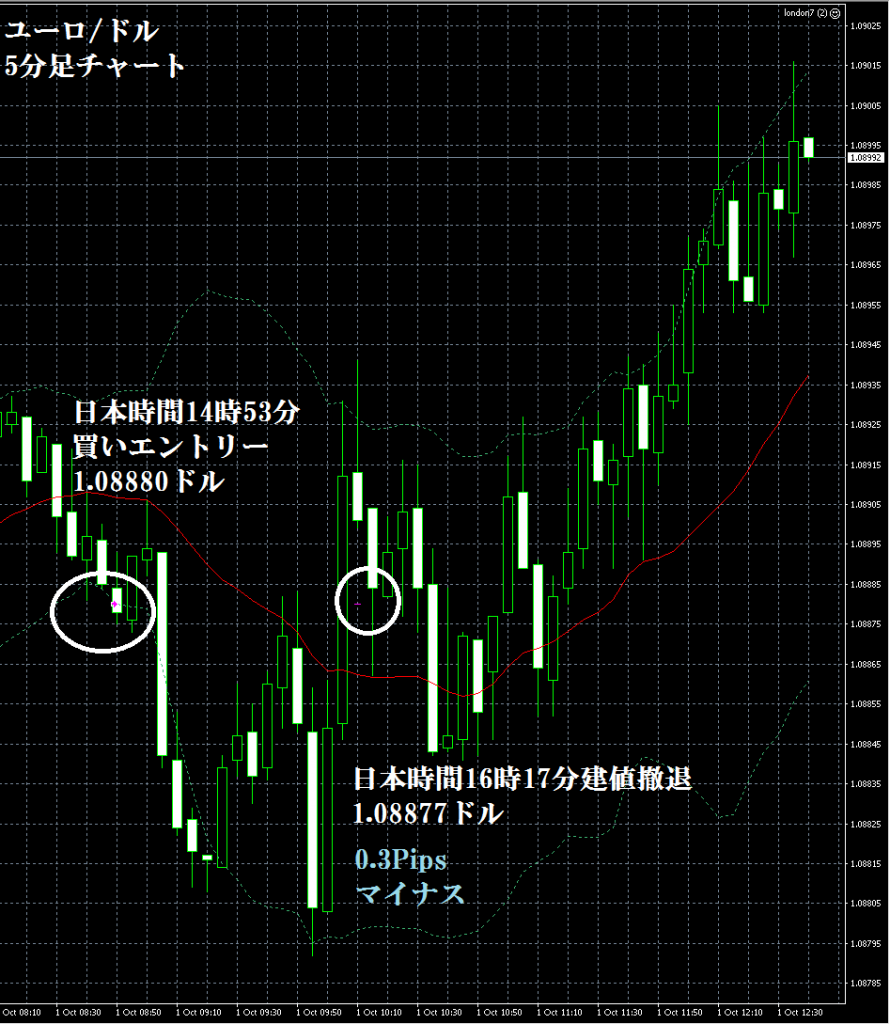JUGEMテーマ:FX 情報分析 10月3日のFXTF(ゴールデンウエイ・ジャパン)の1000通貨コースでのデモトレードで自作EA「ロンドンは午前7時」は、日本時間15時3分にユーロ/ドルのロングポジション(ユーロ買いドル売り)を1.09552ドルでエントリーし日本時間17時20分に1.09530ドルでポジションをクローズして2.2Pipsのマイナスで1,180円の損失となった。(Lot数は0.5。5万通貨) 2月26日からのフォワードテスト67勝34敗(67勝/101トレード、勝率66.33%、引き分け含まず)で187.5pipsのプラスで13万8,630円の利益となった。...