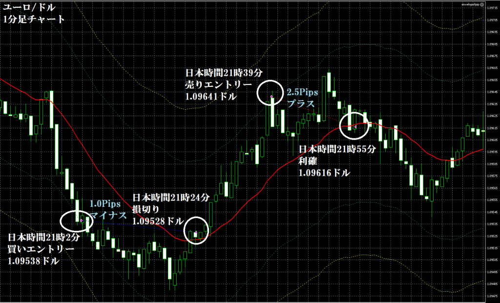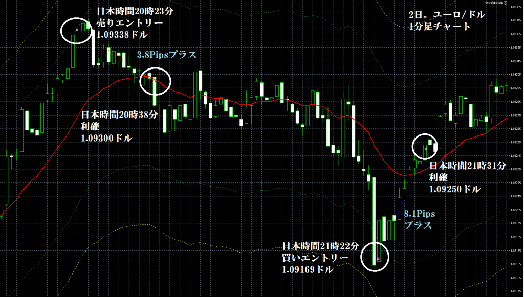 現在、GogoJungle(ゴゴジャン)にて販売中のエンベロープを使用したユーロ/ドルの1分足スキャルピングの自作EA(自動売買ソフト)「えんべろ」。 先日購入した書籍「トレーディングシステムの開発と検証と最適化」(パンローリング社)に従ってパラメータを変更しながら最適化して8月19日からフォワードテスト中。 旧バージョンからでは4月3日からFXTF(FXトレードフィナンシャル)の1000通貨コースのデモ口座でフォワードテスト中。 新EA「えんべろV2」は10月2日の日本時間の20時23分にユーロ/ドルのショ...