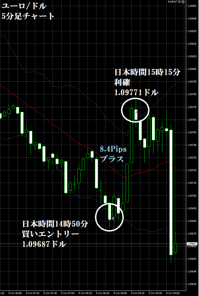 JUGEMテーマ:FX 情報分析 10月4日のFXTF(ゴールデンウエイ・ジャパン)の1000通貨コースでのデモトレードで自作EA「ロンドンは午前7時」は、日本時間14時50分にユーロ/ドルのロングポジション(ユーロ買いドル売り)を1.09687ドルでエントリーし日本時間15時15分に1.09771ドルでポジションをクローズして8.4Pipsのプラスで4,484円の利益となった。(Lot数は0.5。5万通貨) 2月26日からのフォワードテスト68勝34敗(68勝/102トレード、勝率66.66%、引き分け含まず)で195.9pipsのプラスで14万3,114円の利益となった。 ...