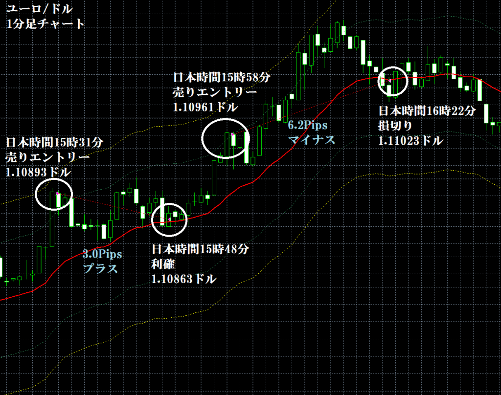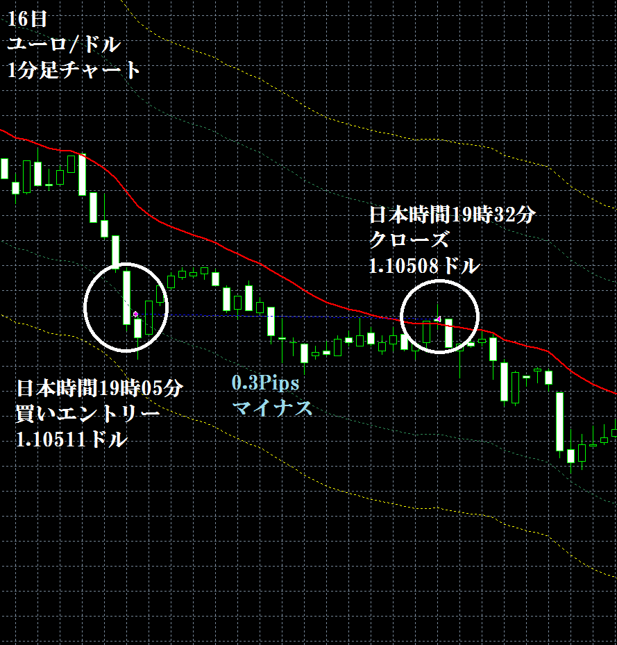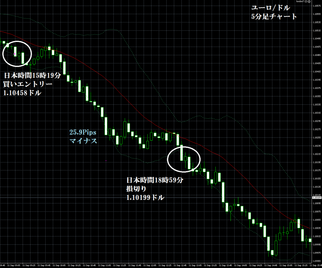 JUGEMテーマ:FX 情報分析 9月11日のFXTF(ゴールデンウエイ・ジャパン)の1000通貨コースでのデモトレードで自作EA「ロンドンは午前7時」は、日本時間15時19分にユーロ/ドルのロングポジション(ユーロ買いドル売り)を1.10458ドルでエントリーし日本時間18時59分に1.10199ドルでポジションをクローズして25.9Pipsのマイナスで13,947円の損失となった。(Lot数は0.5。5万通貨) 2月26日からのフォワードテスト60勝28敗(60勝/88トレード、勝率68.18%、引き分け含まず)で188.2pipsのプラスで13万9,026円の利益となっ...