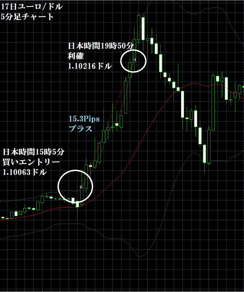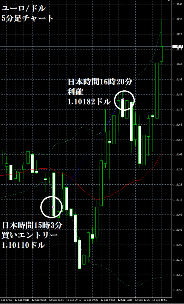 JUGEMテーマ:FX 情報分析 9月17日のFXTF(ゴールデンウエイ・ジャパン)の1000通貨コースでのデモトレードで自作EA「ロンドンは午前7時」は、日本時間15時05分にユーロ/ドルのロングポジション(ユーロ買いドル売り)を1.10063ドルでエントリーし日本時間19時50分に1.10216ドルでポジションをクローズして15.3Pipsのプラスで8,273円の利益となった。(Lot数は0.5。5万通貨) 9月18日のFXTF(ゴールデンウエイ・ジャパン)の1000通貨コースでのデモトレードで自作EA「ロンドンは午前7時」は、日...