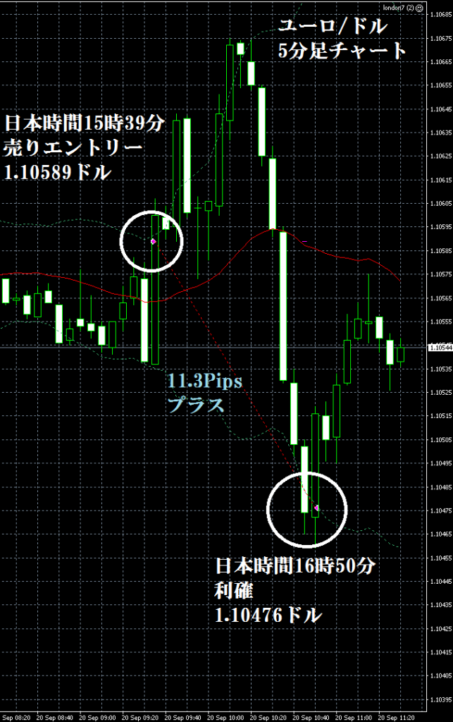 JUGEMテーマ:FX 情報分析 9月20日のFXTF(ゴールデンウエイ・ジャパン)の1000通貨コースでのデモトレードで自作EA「ロンドンは午前7時」は、日本時間15時39分にユーロ/ドルのショートポジション(ユーロ売りドル買い)を1.10589ドルでエントリーし日本時間16時50分に1.10476ドルでポジションをクローズして11.3Pipsのプラスで6,098円の利益となった。(Lot数は0.5。5万通貨) 2月26日からのフォワードテスト64勝30敗(64勝/94トレード、勝率68.05%、引き分け含まず)で182.7pipsのプラスで13万6,040円の利益となった...