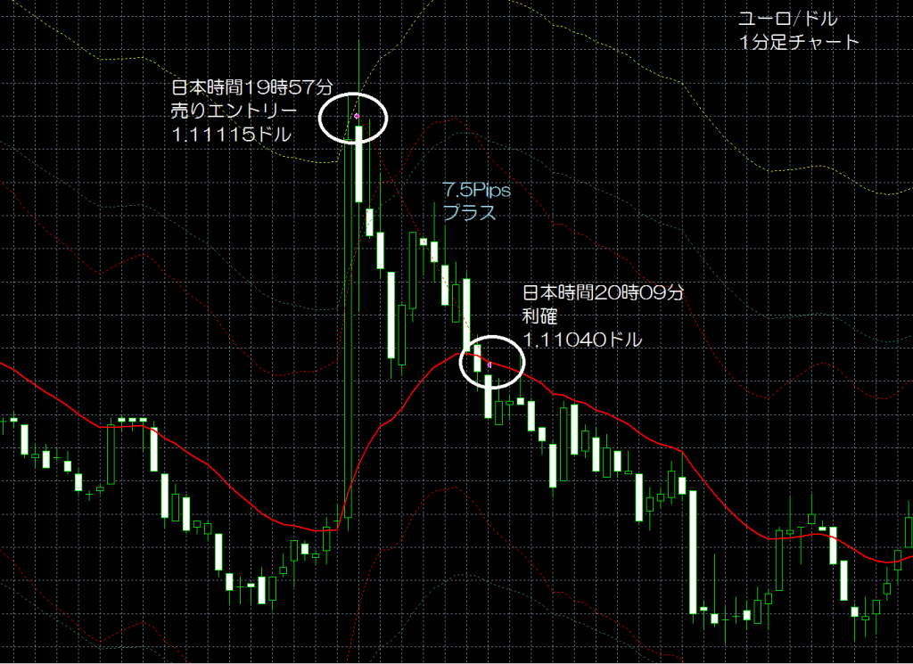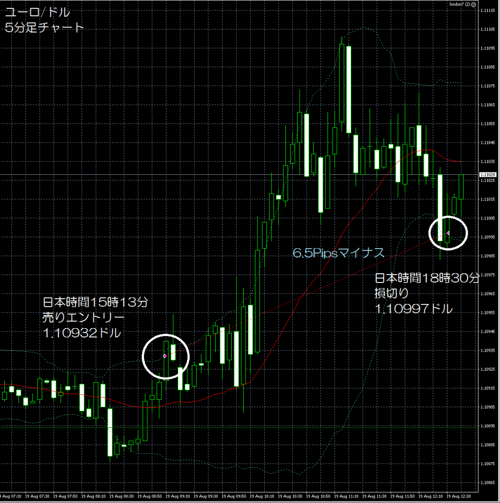 JUGEMテーマ:FX 情報分析 8月19日のFXTF(ゴールデンウエイ・ジャパン)の1000通貨コースでのデモトレードで自作EA「ロンドンは午前7時」は、日本時間15時13分にユーロ/ドルのショートポジション(ユーロ売りドル買い)を1.10932ドルでエントリーし日本時間18時30分に1.10997ドルでポジションをクローズして6.5Pipsのマイナスで3,464円の損失となった。(Lot数は0.5。5万通貨) 2月26日からのフォワードテスト53勝23敗(53勝/76トレード、勝率69.73%、引き分け含まず)で185.2pipsのプラスで13万7,588円の利益となっ...