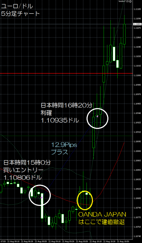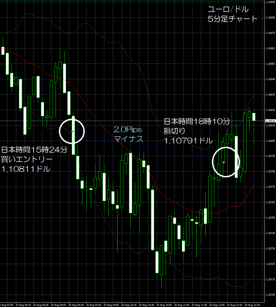 JUGEMテーマ:FX 情報分析 8月20日のFXTF(ゴールデンウエイ・ジャパン)の1000通貨コースでのデモトレードで自作EA「ロンドンは午前7時」は、日本時間15時24分にユーロ/ドルのロングポジション(ユーロ買いドル売り)を1.10811ドルでエントリーし日本時間18時10分に1.10791ドルでポジションをクローズして2.0Pipsのマイナスで1,064円の損失となった。(Lot数は0.5。5万通貨) 2月26日からのフォワードテスト53勝24敗(53勝/77トレード、勝率68.83%、引き分け含まず)で183.2pipsのプラスで13万6,524円の利益となった...