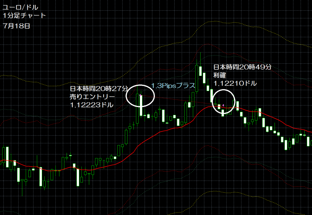 JUGEMテーマ:FX 情報分析 現在、GogoJungle(ゴゴジャン)にて販売中のエンベロープを使用したユーロ/ドルの1分足スキャルピングの自作EA(自動売買ソフト)「えんべろ」。 4月3日からFXTF(FXトレードフィナンシャル)の1000通貨コースのデモ口座でフォワードテスト中。 自作EA「えんべろ」は7月18日の日本時間の20時27分にユーロ/ドルのショート(ユーロ売りドル買い)を1.12223ドルでエントリーし日本時間の20時49分に1.12210ドルでポジションをクローズして1.3pipsのプラスで1,400円の利益となった。(Lot数は...