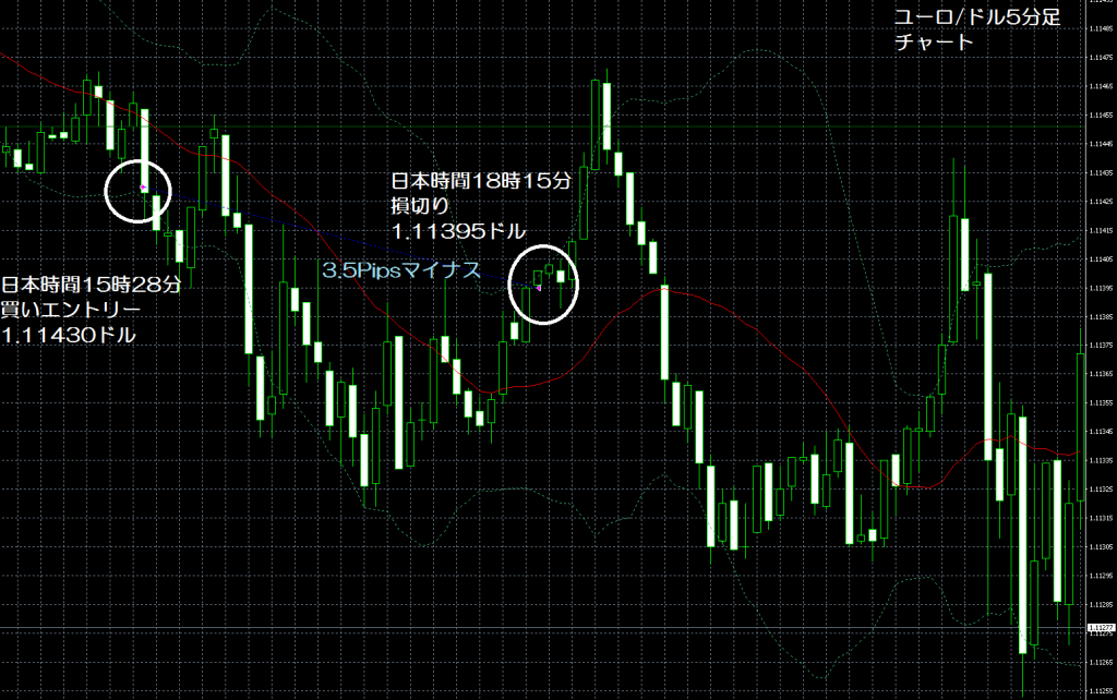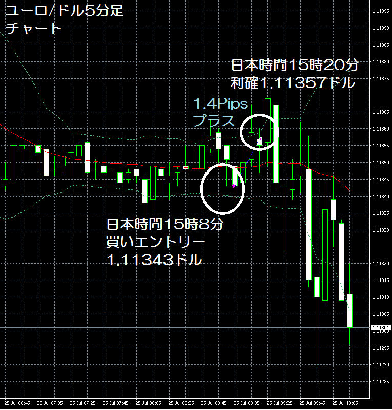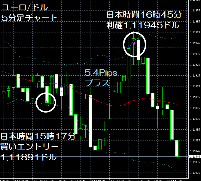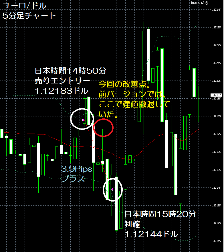 JUGEMテーマ:FX 情報分析 7月22日のFXTF(FXトレードフィナンシャル)の1000通貨コースでのデモトレードで自作EA「ロンドンは午前7時」は、日本時間14時50分にユーロ/ドルのショートポジション(ユーロ買いドル売り)を1.12183ドルでエントリーし日本時間15時20分に1.12144ドルでポジションをクローズして3.9Pipsのプラスで2,107円の利益となった。(Lot数は0.5。5万通貨) 今回は、バージョンアップでの改善点?の「損切り値を建値に変更するタイミング」で変更前だったら、ボリンジャーバンドの−2σにタッチした...