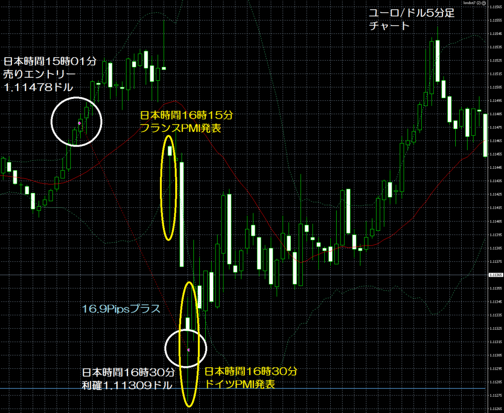 JUGEMテーマ:FX 情報分析 7月24日のFXTF(FXトレードフィナンシャル)の1000通貨コースでのデモトレードで自作EA「ロンドンは午前7時」は、日本時間15時01分にユーロ/ドルのショートポジション(ユーロ売りドル買い)を1.11478ドルでエントリーし日本時間16時30分に1.11309ドルでポジションをクローズして16.9Pipsのプラスで9,130円の利益となった。(Lot数は0.5。5万通貨) 2月26日からのフォワードテスト43勝18敗(43勝/61トレード、勝率70.49%、引き分け含まず)で164.4pipsのプラスで12万6,582円の利益となった。 ...