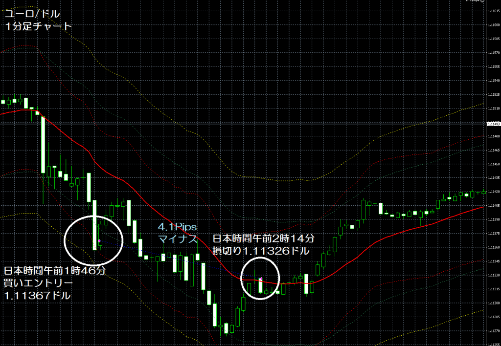 JUGEMテーマ:FX 情報分析 現在、GogoJungle(ゴゴジャン)にて販売中のエンベロープを使用したユーロ/ドルの1分足スキャルピングの自作EA(自動売買ソフト)「えんべろ」。 4月3日からFXTF(FXトレードフィナンシャル)の1000通貨コースのデモ口座でフォワードテスト中。 自作EA「えんべろ」は7月26日の日本時間の午前1時46分にユーロ/ドルのロング(ユーロ買いドル売り)を1.11367ドルでエントリーし日本時間の午前2時14分に1.11326ドルでポジションをクローズして4.1pipsマイナスで4,460円の損失となった。(Lot...