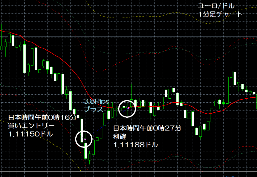 JUGEMテーマ:FX 情報分析 現在、GogoJungle(ゴゴジャン)にて販売中のエンベロープを使用したユーロ/ドルの1分足スキャルピングの自作EA(自動売買ソフト)「えんべろ」。 4月3日からFXTF(FXトレードフィナンシャル)の1000通貨コースのデモ口座でフォワードテスト中。 自作EA「えんべろ」は7月27日の日本時間の午前0時16分にユーロ/ドルのロング(ユーロ買いドル売り)を1.11150ドルでエントリーし日本時間の午前0時27分に1.11188ドルでポジションをクローズして3.8pipsのプラスで4,130円の利益となった。(Lot...