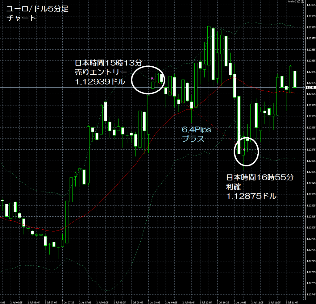 JUGEMテーマ:FX 情報分析 7月4日のFXTF(FXトレードフィナンシャル)の1000通貨コースでのデモトレードで自作EA「ロンドンは午前7時」は、日本時間14時50分にユーロ/ドルのロングポジション(ユーロ買いドル売り)を1.12832ドルでエントリーし日本時間17時10分に1.12871ドルでポジションをクローズして3.9Pipsのマプラスで2,102円の利益となった。(Lot数は0.5。5万通貨) 2月26日からのフォワードテスト36勝15敗(36勝/52トレード、勝率69.23%、引き分け含まず)で143.1pipsのプラスで11万5,080円の利益となった。 ...