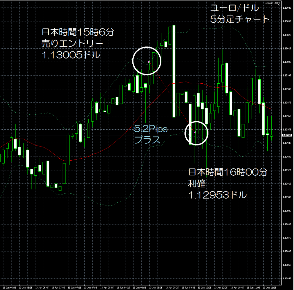 JUGEMテーマ:FX 情報分析 6月13日のFXTF(FXトレードフィナンシャル)の1000通貨コースでのデモトレードで自作EA「ロンドンは午前7時」は、日本時間15時08分にユーロ/ドルのショートポジション(ユーロ売りドル買い)を1.13005ドルでエントリーし日本時間16時00分に1.12953ドルでポジションをクローズして5.2Pipsのプラスで2,817円の利益となった。(Lot数は0.5。5万通貨) 2月26日からのフォワードテスト31勝12敗(31勝/44トレード、勝率70.45%、引き分け含まず)で143.0pipsのプラスで11万4,982円の利益となった。 ...