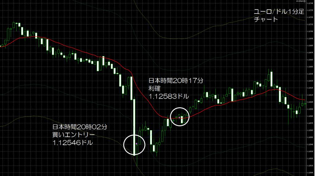 JUGEMテーマ:FX 情報分析 現在、GogoJungle(ゴゴジャン)にて販売中のエンベロープを使用したユーロ/ドルの1分足スキャルピングの自作EA(自動売買ソフト)「えんべろ」。 4月3日からFXTF(FXトレードフィナンシャル)の1000通貨コースのデモ口座でフォワードテスト中。 自作EA「えんべろ」は6月14日の日本時間の20時02分にユーロ/ドルのロング(ユーロ買いドル売り)を1.12546ドルでエントリーし日本時間の20時17分に1.12583ドルでポジションをクローズして3.7pipsのプラスで4,000円の利益となった。(Lot数は1.0...