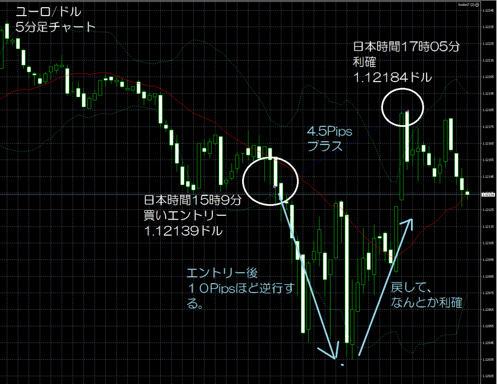 JUGEMテーマ:FX 情報分析 6月17日のFXTF(FXトレードフィナンシャル)の1000通貨コースでのデモトレードで自作EA「ロンドンは午前7時」は、日本時間15時09分にユーロ/ドルのロングポジション(ユーロ買いドル売り)を1.12139ドルでエントリーし日本時間17時05分に1.12184ドルでポジションをクローズして4.5Pipsのプラスで2,443円の利益となった。(Lot数は0.5。5万通貨) 2月26日からのフォワードテスト33勝12敗(33勝/46トレード、勝率71.73%、引き分け含まず)で152.5pipsのプラスで12万132円の利益となった。 ...