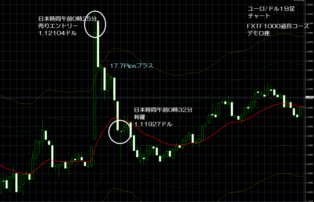 JUGEMテーマ:FX 情報分析 現在、GogoJungle(ゴゴジャン)にて販売中のエンベロープを使用したユーロ/ドルの1分足スキャルピングの自作EA(自動売買ソフト)「えんべろ」。 4月3日からFXTF(FXトレードフィナンシャル)の1000通貨コースのデモ口座でフォワードテスト中。 自作EA「えんべろ」は6月19日の日本時間の午前0時25分にユーロ/ドルのショート(ユーロ売りドル買い)を1.12104ドルでエントリーし日本時間の午前0時時32分に1.11927ドルでポジションをクローズして17.7pipsのプラスで19,180円の利益となった...