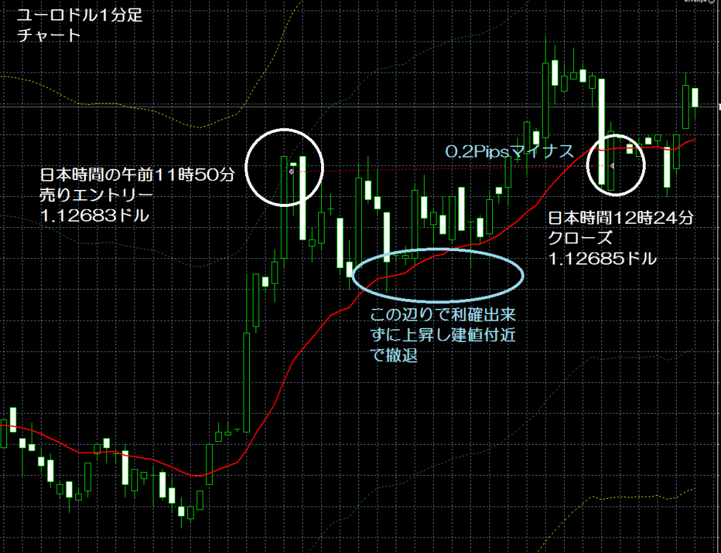 JUGEMテーマ:FX 情報分析 現在、GogoJungle(ゴゴジャン)にて販売中のエンベロープを使用したユーロ/ドルの1分足スキャルピングの自作EA(自動売買ソフト)「えんべろ」。 4月3日からFXTF(FXトレードフィナンシャル)の1000通貨コースのデモ口座でフォワードテスト中。 自作EA「えんべろ」は6月20日の日本時間の午前11時50分にユーロ/ドルのショート(ユーロ売りドル買い)を1.12683ドルでエントリーし日本時間の12時24分に1.12685ドルでポジションをクローズして0.2pipsのマイナスで220円の損失となった。(Lot...