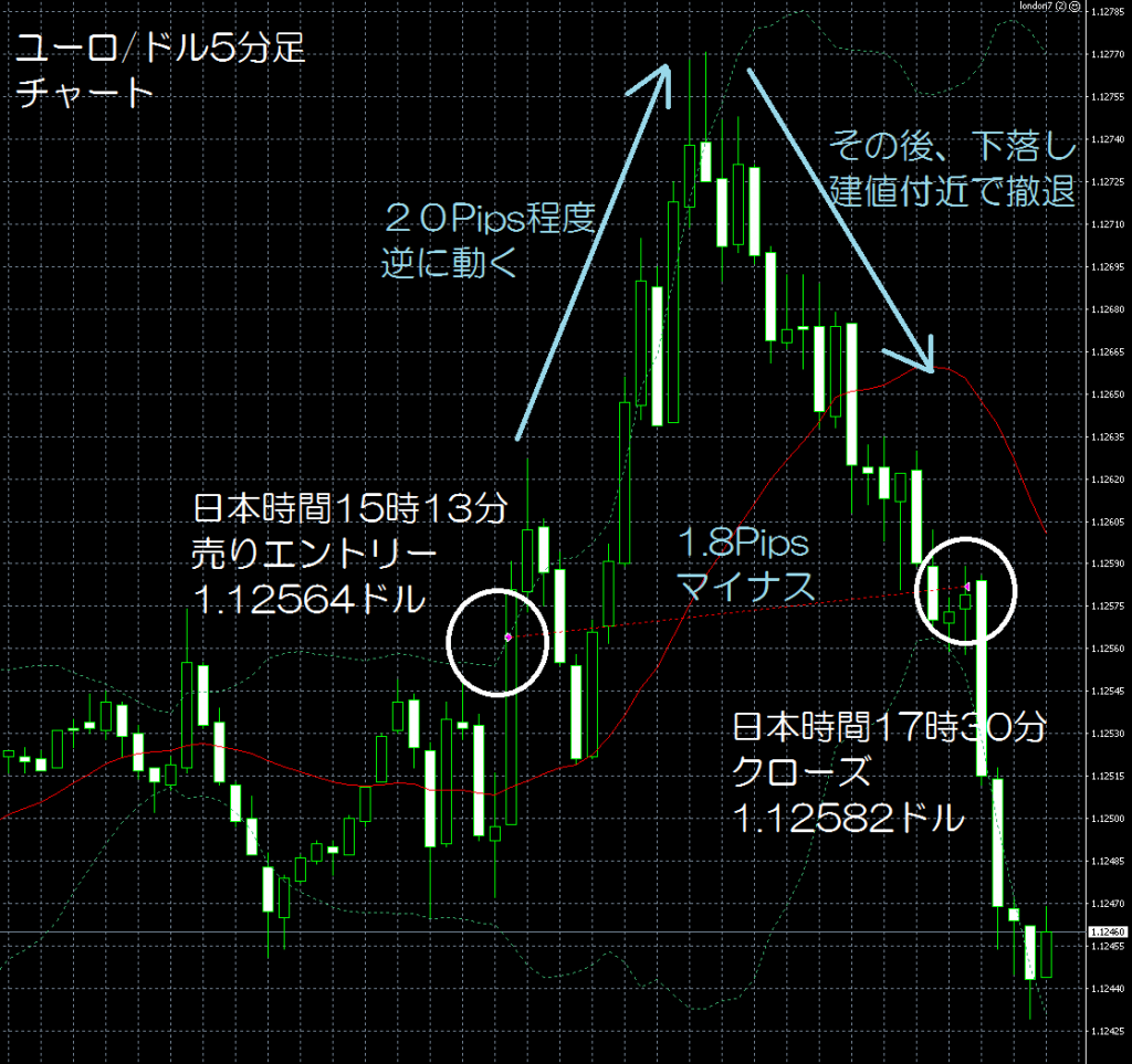 JUGEMテーマ:FX 情報分析 6月4日のFXTF(FXトレードフィナンシャル)の1000通貨コースでのデモトレードで自作EA「ロンドンは午前7時」は、日本時間15時13分にユーロ/ドルのショートポジション(ユーロ売りドル買い)を1.12564ドルでエントリーし日本時間17時30分に1.12582ドルでポジションをクローズして1.8Pipsのマイナスで972円の損失となった。(Lot数は0.5。5万通貨) 2月26日からのフォワードテスト27勝12敗(27勝/40トレード、勝率67.50%)で123.5pipsのプラスで10万4,424円の利益となった。 エントリーし...