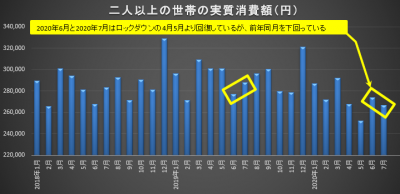 JUGEMテーマ:フランスに関するニュース JUGEMテーマ:経済成長 JUGEMテーマ:政界批判 今日は「補償をしっかりやったフランスは家計消費がV字回復」と題して論説します。 総務省が発表した7月の家計調査によれば、2人以上の世帯の消費支出は、26万6897円と、物価変動の影響を除いた実質値で、前年同月比▲7.6%となりました。 4月〜5月の2桁減少から6月は▲1.2%減少に持ち直したものの、新型コロナウイルス感染が再び拡大した7月に、減少幅が拡大しました。 下...