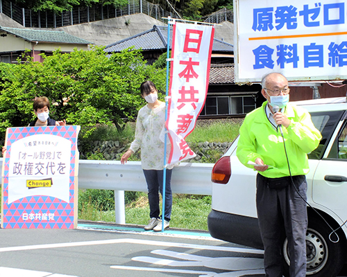 10月までには必ず実施される総選挙は、もう目前です。「定数6の衆院比例四国ブロックで、なんとしても白川よう子さんを押し上げ、野党で半数以上を占めることは、野党連合政権を四国からつくる一番の力になる」(志位和夫委員長)――。四国各県の日本共産党は14日、四国ブロック一斉宣伝(毎月第2金曜日)に取り組み、愛媛では過去最大規模の77カ所で93人が参加し、日本共産党の勢いを示しました。 「白川さんを国会へ」と訴える西井南予地区委員長(14日、八幡浜市) 八幡浜市 八幡浜市では西井直人南予地区委...