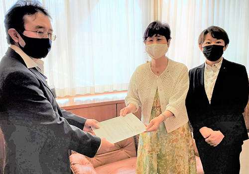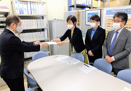 黒川理財部長(左)に要望書を手渡す、日本共産党の小崎市議と杉村市議、片岡氏(14日、松山市役所) 日本共産党松山市議団は14日、コロナ感染拡大「第4波」の渦中で感染の連鎖を広げないために、大規模なPCR検査と高齢者施設などでの職員・利用者の検査を、これまで以上に拡充するよう野志克仁市長に要望しました。小崎愛子市議と杉村千栄市議が黒川泰雅理財部長に要望書を手渡し、片岡朗党県コロナ対策委員会事務局長(衆院1区予定候補)が同席しました。 小崎、杉村両市議は「行政として、...