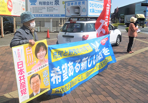 一斉宣伝に取り組む伊藤東予地区委員長と越智市議、党支部のみなさん(16日、西条市) 「総選挙で四国から白川よう子さんを国会へ送り出そう」と日本共産党西条市委員会は、ことし3月から毎月第3金曜日を「西条一斉宣伝日」に決め、2回目となる4月は16日に実施しました。 4カ所で宣伝し、市民が車の中から手を振ったり、駐車場に車を止めて両手を大きく振って激励するなど、どこでも温かい応援がありました。 市総合文化会館前とフジグラン西条前では、5人が宣伝。伊藤学東予地区委員長と...
