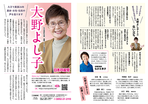 JUGEMテーマ:共産党(日本共産党) 久万高原町議会議員選挙に立候補を予定する大野よし子さんの政策を紹介する久万高原民報を発行しました。 画像をクリックするとPDFが開きます。ぜひご覧ください。 【P1・P4】 【P2・P3】