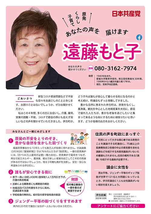 JUGEMテーマ:共産党(日本共産党) 伊方町議会議員選挙に立候補を予定する遠藤もと子さんの政策を紹介する伊方民報を発行しました。 画像をクリックするとPDFが開きます。ぜひご覧ください。 【表面】 【裏面】