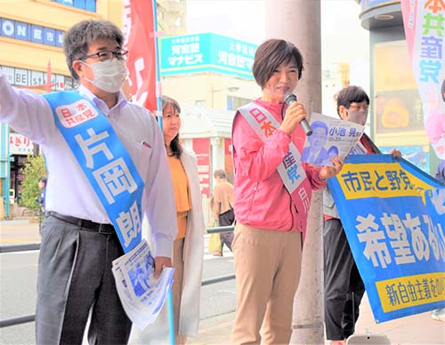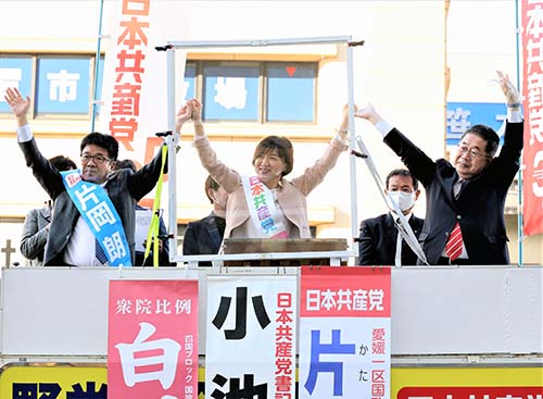 JUGEMテーマ:共産党(日本共産党) 聴衆の激励の拍手に応える(右から)小池書記局長、白川衆院比例候補、片岡1区候補ら(10月25日、松山市) 日本共産党の小池晃書記局長・参院議員は、臨時国会開会を翌日に控えた10月25日、松山市の市駅前で、白川よう子衆院比例予定候補と片岡朗衆院愛媛1区予定候補らとともに街頭演説。「菅政権は、日本学術会議人事への介入など、安倍政権以上に乱暴で強権的な政権だと浮き彫りになってきた。来るべき総選挙で菅政権を倒し、野党連合政権をつくろう」と訴えま...