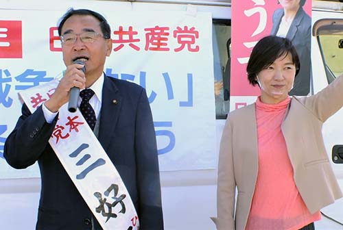 JUGEMテーマ:共産党(日本共産党) 四国中央市議選(定数22)は8日告示(15日投票)。日本共産党は、現職の三好ひとし(68)、ひだかゆうすけ(39)、新人の島勝之(73)の3氏が3議席死守へ全力を上げています。 10月21日には白川よう子衆院比例予定候補が応援に駆けつけ、7カ所で街頭演説。「四国中央市の3人の党市議団は、市民のみなさんと力を合わせて、高い国保料の引き下げ、県下で最初に中学校卒業までの医療費完全無料化を実現してきました。市議選では、必ず3議席の獲得をさせてください」と訴えまし...
