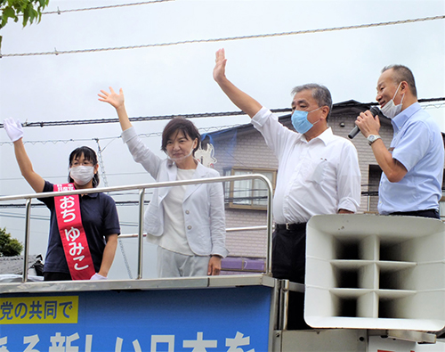 JUGEMテーマ:共産党(日本共産党) 激励に応える(右から)伊藤学東予地区委員長、山地市議、白川衆院比例予定候補、おち市議予定候補の4氏(9月25日、西条市) 「日本共産党まちかど演説会」と銘打って白川よう子衆院比例予定候補は9月25日、西条市2カ所で、「コロナ禍の中、誰一人置き去りにしない政治の実現を一緒にすすめよう」と呼びかけました。 新町自治会館前では、青野貴司市議と、来年2月の市議選で青野市議と交代する、おちゆみこ市議予定候補とともに街頭演説。住民や支持者...