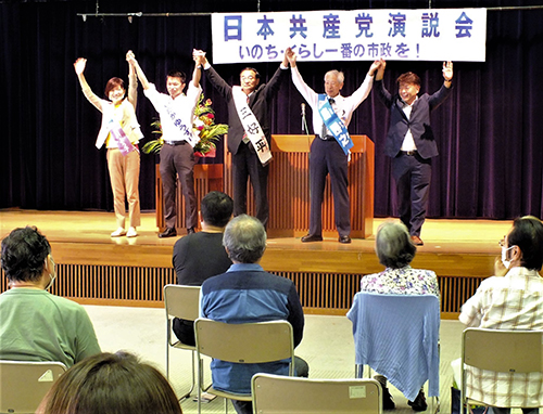 JUGEMテーマ:共産党(日本共産党) 参加者の大きな激励の拍手に応える(右から)仁比、島、三好、ひだか、白川の5氏(9月27日、四国中央市) 日本共産党演説会が9月27日、四国中央市の市福祉会館で開催され、107人が参加。仁比聡平前参院議員と白川よう子党四国ブロック国政対策委員長(衆院比例予定候補)、市議選(11月8日告示)を戦う三好ひとし市議、ひだかゆうすけ市議、新人の島勝之くらしの相談室長が「『安倍政治』の継続を許さず、命・くらし一番の市政実現を」と訴えました。参加...