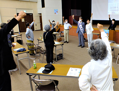 JUGEMテーマ:共産党(日本共産党) ガンバロー三唱する(右から)杉村、白川、森、西下氏ら(9月26日、東温市) 日本共産党の森しんいち東温市議の「議会報告会」が9月26日、東温市の市中央公民館で開催され、50人が参加。白川よう子党四国ブロック国政対策委員長(衆院比例予定候補)は、総選挙と市議選での党勝利と、市民と野党の共闘への支援を呼びかけました。 開会あいさつに立った西下光男党市後援会長は「市議選(10月25日投票)は少数激戦であり、森議員の再選を必ず勝ち取らせてほしい...